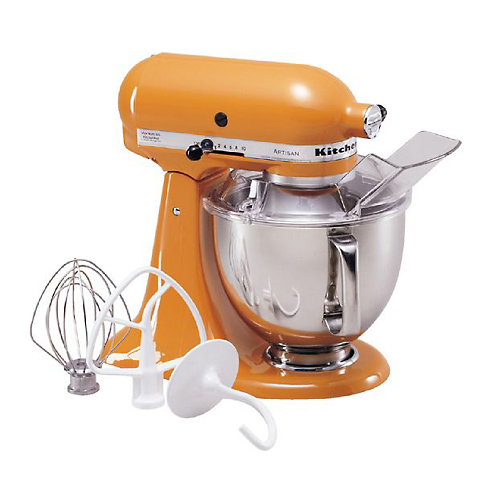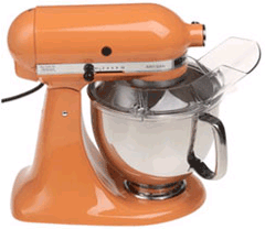 Craft Classic Recipes and Experimental Dishes with the KitchenAid Tangerine Stand MixerThe KitchenAid Tangerine Mixer froths, kneads and mixes simply and quickly for an even, smooth batch every time. Designed to break up chunks of sugar, whisk flour and whip butter into a creamy consistency, this mixer puts the power of simple preparation on your countertop. The perfect way to simplify the time you spend in your kitchen, this mixer has a common sense design and versatile features that will help you make the most delicious treats and satisfying sauces without all the work of mixing by hand. Perfect for whatever you have to mix, the KitchenAid tangerine stand mixer features 10 variable speeds that will allow you to find the perfect speed for your preparation while a set of three interchangeable mixing tools, including a dough hook, wire whip and flat beater, give you just the right touch whether you re folding, kneading or frothing things up. The perfect way to give thick dough and creamy sauces just the right touch, this mixer changes according to your needs quickly and easily. And when that batch of cookies or loaf of bread is ready to make its way into the oven, clean up is a cinch. The KitchenAid tangerine mixer s detachable pouring shield, stainless steel bowl and mixing tools are dishwasher safe so you can pop them in, wipe down the body and call it done. Perfect for a busy household, this mixer is not only easy to clean but built to need little care for a long time. Designed with metal parts and tough planetary gears, it s certain to last for years of delicious meals. Helping you to get just the perfect blend of ingredients again and again, the KitchenAid Tangerine Stand Mixer delivers the power and versatility for dozens of treats, desserts, sauces and more. Built to last and designed to adapt to whatever you re preparing, this hard working mixer will be a countertop favorite for years to come.