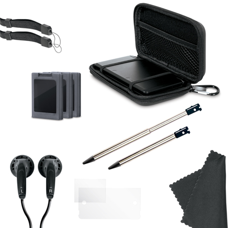affordable dreamGEAR 3DS 11-in-1 Starter Kit - Black Featuring the newest technology in the gaming world, your Nintendo 3DS combines portability with high function for an out-of-this-world gaming experience. Protect that technology by preventing drops, scratches and more to your handheld console with the 11-in-1 Starter Pack for Nintendo 3DS. With a variety of tools and cases to ensure your gaming system stays in top condition, this Starter Pack helps you hit the ground running or enhance the system you already know and love. The 11-in-1 Starter Pack includes a protective case, two precision styluses, earbuds, three game cases, two wrist straps, screen protectors and a cleaning cloth. The earbuds enhance your in-game audio and feature a 3.5mm audio plug and 4' cable, and the two precision styluses provide a comfortable grip that ensures excellent control and accuracy. Cases for your Nintendo 3DS and three game cards ensure lasting use and reduce damage from drops. Two wrist straps offer a proactive way to eliminate the possibility of drops while you're playing. Eliminate scratches, smudges and more with the screen protectors and a cleaning cloth for the top and bottom screens. To top it all off, the black design is sleek and stylish to add an extra element of fun to your Nintendo 3DS.