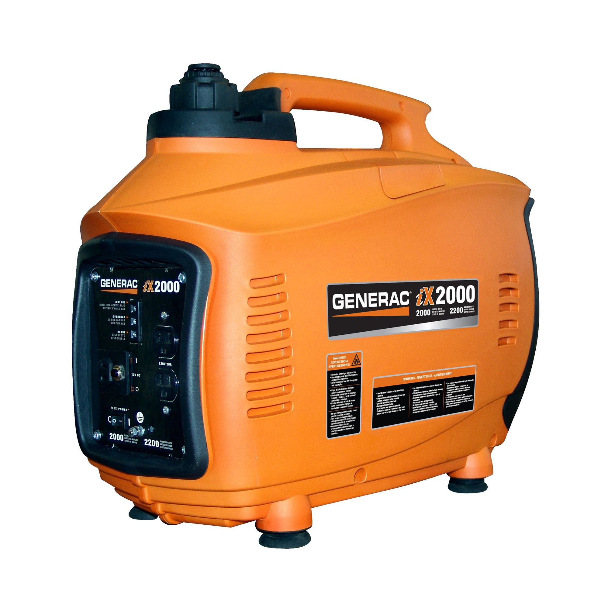 With a range of power options from 800 to 17,500 watts, Generac has an affordable, reliable portable generator for any application. Generac's iX Series inverter technology takes the raw power produced by the generator and passes it through a special electronic microprocessor to provide clean and stable power, safe for computers and other sensitive electronic devices. Designed for life on the road, its durable, lightweight, compact design with built-in handle offers portable power for camping, tailgating, and any recreational use. 2,000 watts of clean power to safely power sensitive electronics. Super compact and up to 40% lighter than a standard generator of equal watts. Built-in handle provides easy portability. Fully-enclosed case for super quiet operation. FlexPower equipped to save fuel and drastically reduce noise. Circuit breaker protected outlets protect against circuit overload. LED status lights on control panel quickly indicate system status. Low-oil shutdown detects low oil levels to prevent engine damage. Start/stop fuel shut-off and choke controls conveniently located on control panel. 12 volt battery charging option. Pull start handle. Run time 4.7 hours at 50% load. Good Housekeeping Seal of Approval. Unit not for use or sale in California, CARB compliant units available. Includes: Engine Oil, Maintenance Kit: Spark Plug Wrench, Screwdriver, Funnel, Battery Charging Cord, Instruction Sheets.