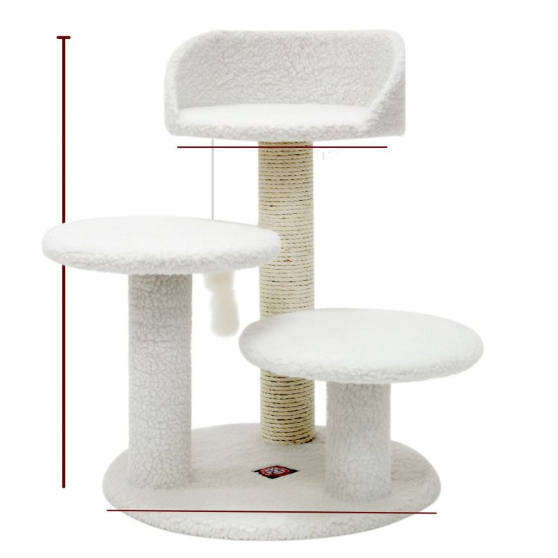 Majestic Pet Products 27" Bungalow Cat Tree is covered in elegant Faux Sheepskin with Sisal Rope wrapped posts that will withstand the toughest claws. This beautiful playground features two flat perches and a nestling cup for long afternoon naps. Assembles in minutes with simple step by step instructions and tools provided. Cleans easily with a vacuum and damp cloth. Dimensions: Height 27" x Length 20" x Width 20".